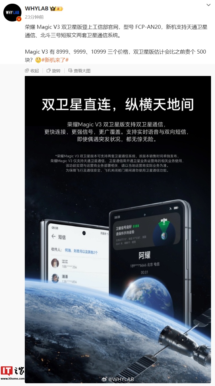 据博主 @WHYLAB 透露,该机为荣耀 Magic V3 折叠屏手机双卫星版。
