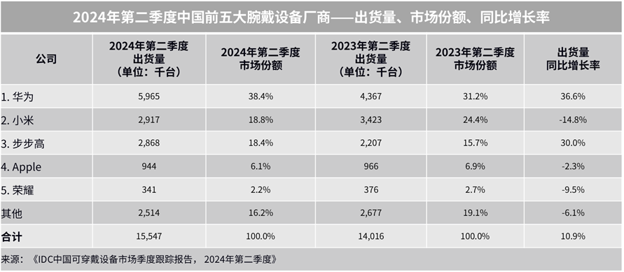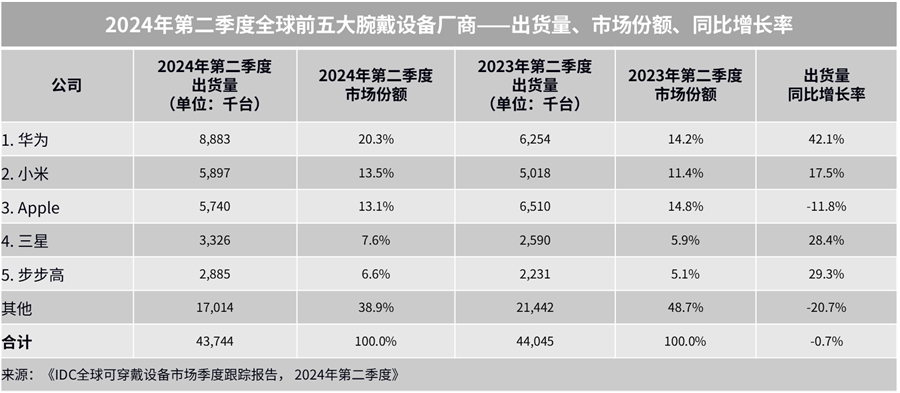 IT之家 9 月 5 日消息,根据国际数据公司(IDC)最新发布的《全球可穿戴设备市场季度跟踪报告》,2024 年第二季度全球腕戴设备市场出货 4,374 万台,同比下滑 0.7%;中国腕戴设备市场出货量为 1,555 万台,同比增长 10.9%,发展速度明显超过全球市场。