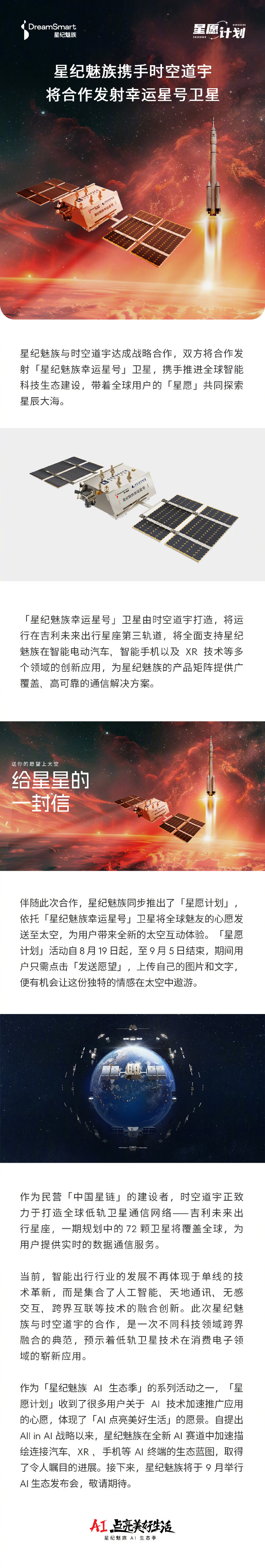 IT之家注意到,星纪魅族于 9 月 2 日宣布将与时空道宇合作发射“星纪魅族幸运星号”卫星,并提出了“星愿计划”,依托该卫星将全球魅友的心愿发送至太空。