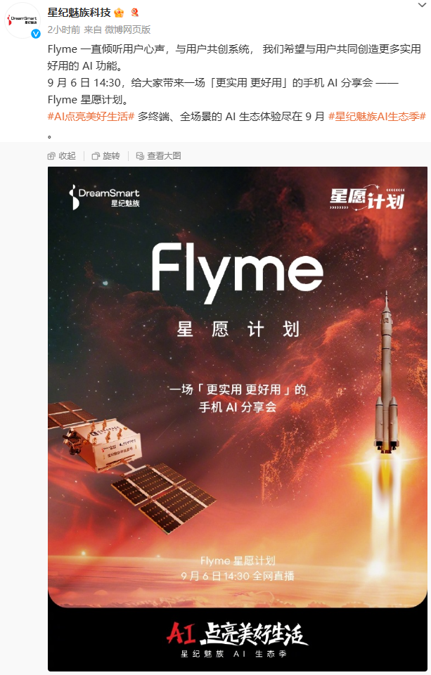 IT之家 9 月 5 日消息,星纪魅族今日宣布,将于 9 月 6 日 14:30 (明日)给大家带来一场「更实用更好用」的手机 AI 分享会 —— Flyme 星愿计划。