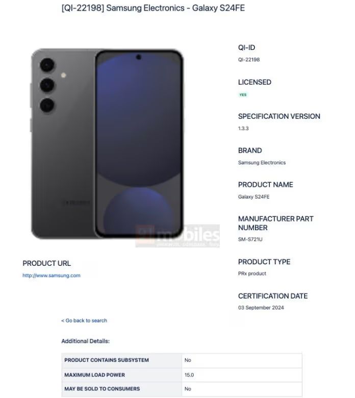 IT之家 9 月 5 日消息,科技媒体 91Mobile 昨日(9 月 4 日)发布博文,挖掘 Wireless Power Consortium 平台数据,发现了三星 Galaxy S24 FE 手机的踪迹,并确认该机和 Galaxy S24 系列一样,支持 15W 无线充电。