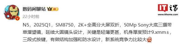 该手机将搭载高通骁龙 8 Gen 4 处理器(SM8750),屏幕分辨率 2K+。从博主文中所指明的“N5”来看,这款新机预计同样来自 OPPO。