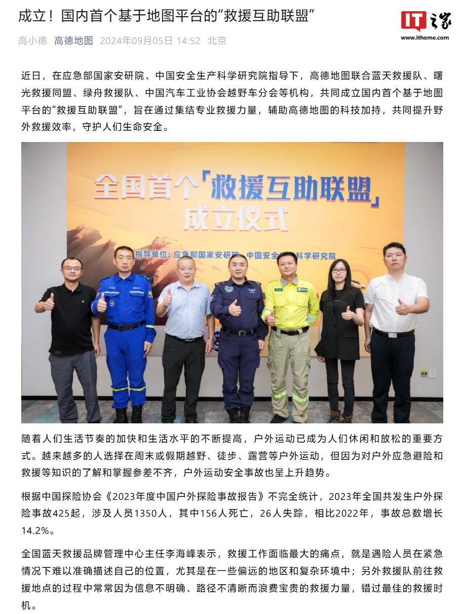 文章来源于互联网:IT之家-国内首个基于地图平台的“救援互助联盟”成立:国家安研院、高德地图、蓝天救援队等参与