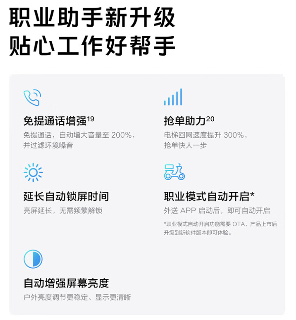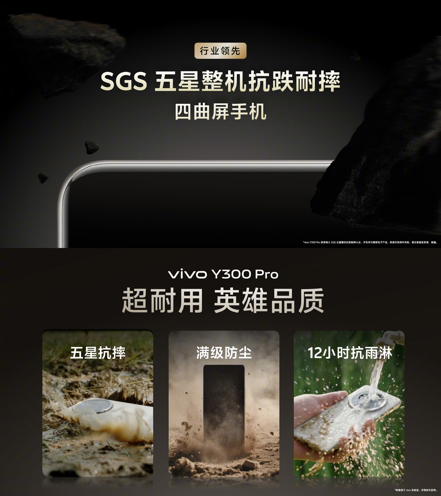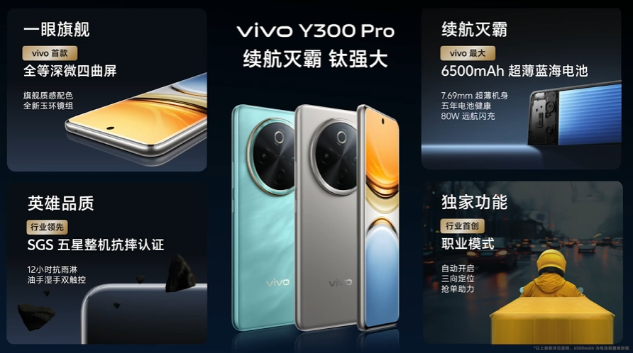 vivo Y300 Pro 手机通过 SGS 五星整机抗跌摔认证,支持 12 小时抗雨淋、油手 / 湿手触控;升级“职业模式”为第二代,外送 App 启动后可自动开启,支持三向定位、免提通话自动增加音量至 200%、电梯回网速度提升 300%、延长自动锁屏时间、自动增强屏幕亮度等功能。