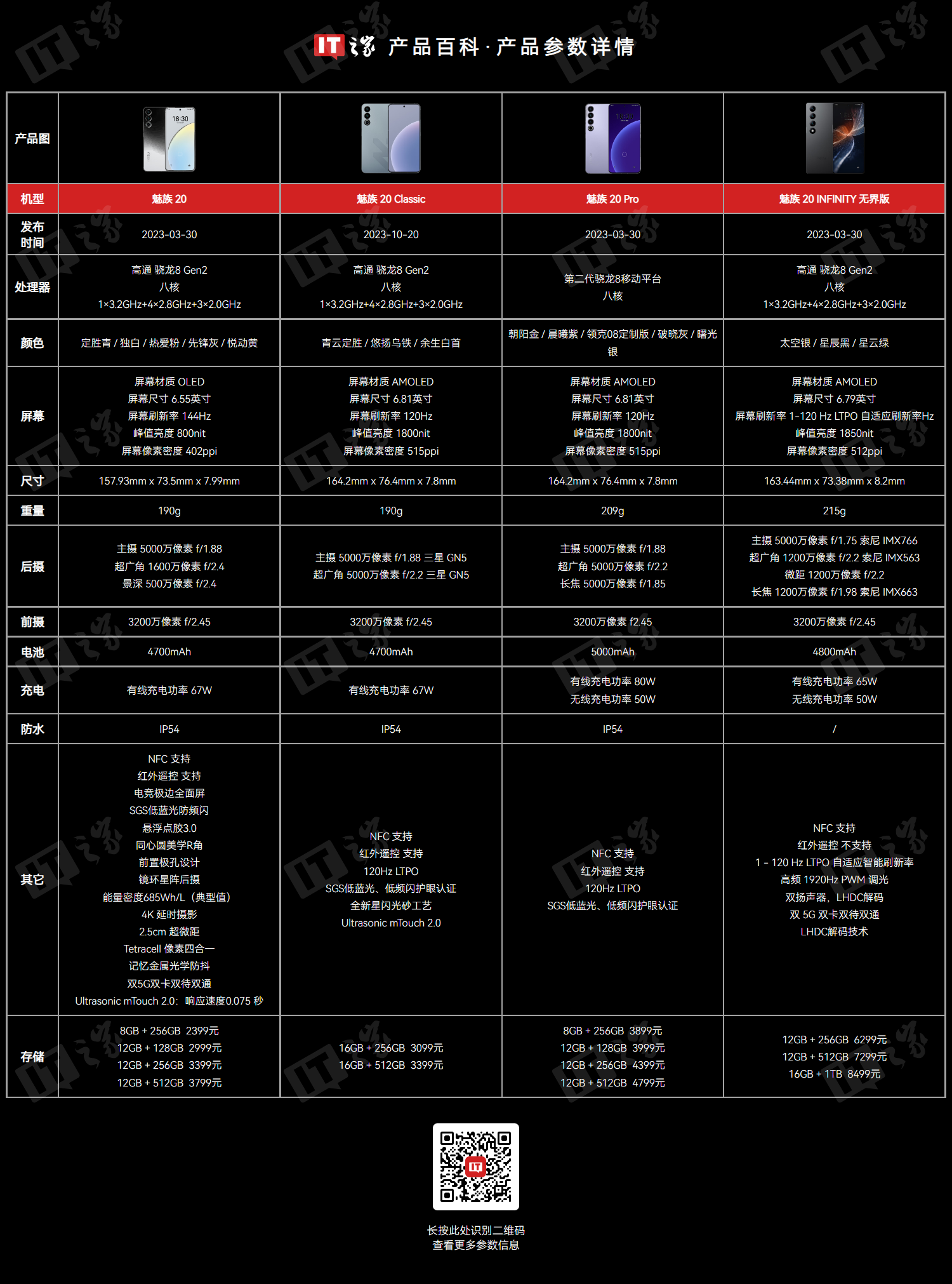 魅族 20 系列手机发布于去年 3 月,全系搭载骁龙 8 Gen2 处理器,标准版配备 6.55 英寸 OLED 直屏,支持最高 144Hz 刷新率;内置 4700mAh 电池,支持 67W 快充;Pro 版配备 6.81 英寸直屏,支持 120Hz 高刷,内置 5000mAh 电池,支持 80W 有线、50W 无线快充。