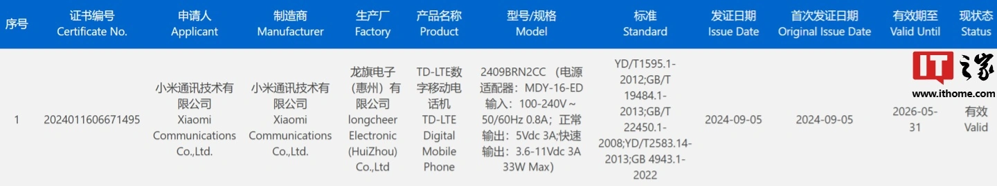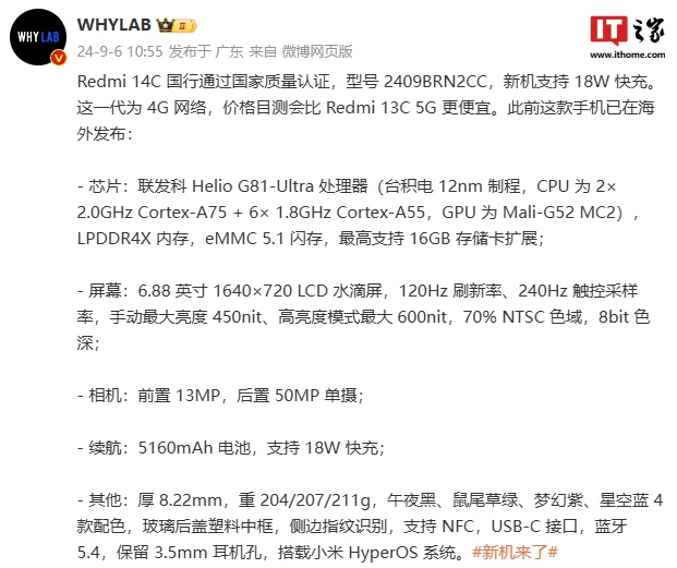 IT之家 9 月 6 日消息,一款型号为“2409BRN2CC”的小米新机于 9 月 5 日通过了国内 3C 认证,据博主 @WHYLAB 透露该机为 Redmi 14C。