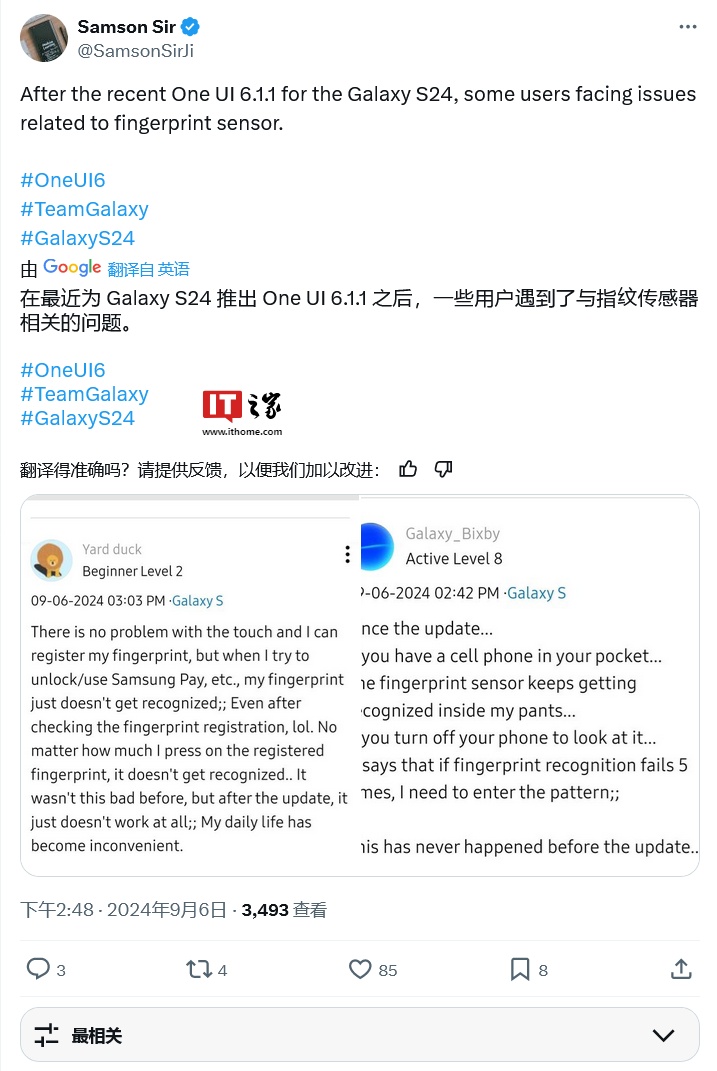 文章来源于互联网:IT之家-三星 Galaxy S24 系列手机升级 One UI 6.1.1 后反馈遇到指纹验证问题