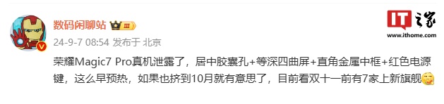 根据博主 @数码闲聊站 的描述,荣耀 Magic7 Pro 采用居中胶囊孔 + 等深四曲屏 + 直角金属中框 + 红色电源键,目前看双十一前有 7 家上新旗舰。