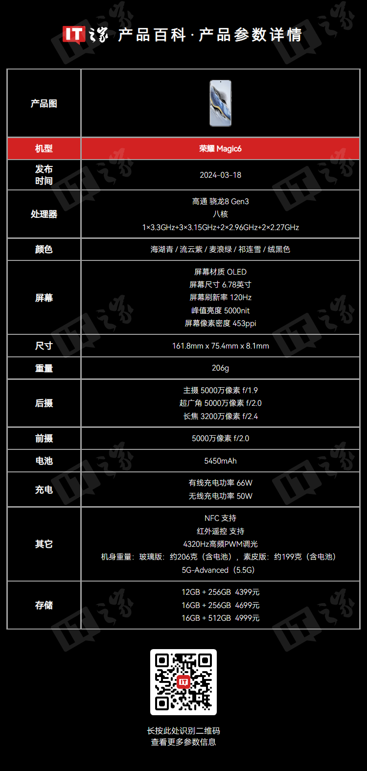 作为参考,IT之家附荣耀 Magic6 手机规格如下: