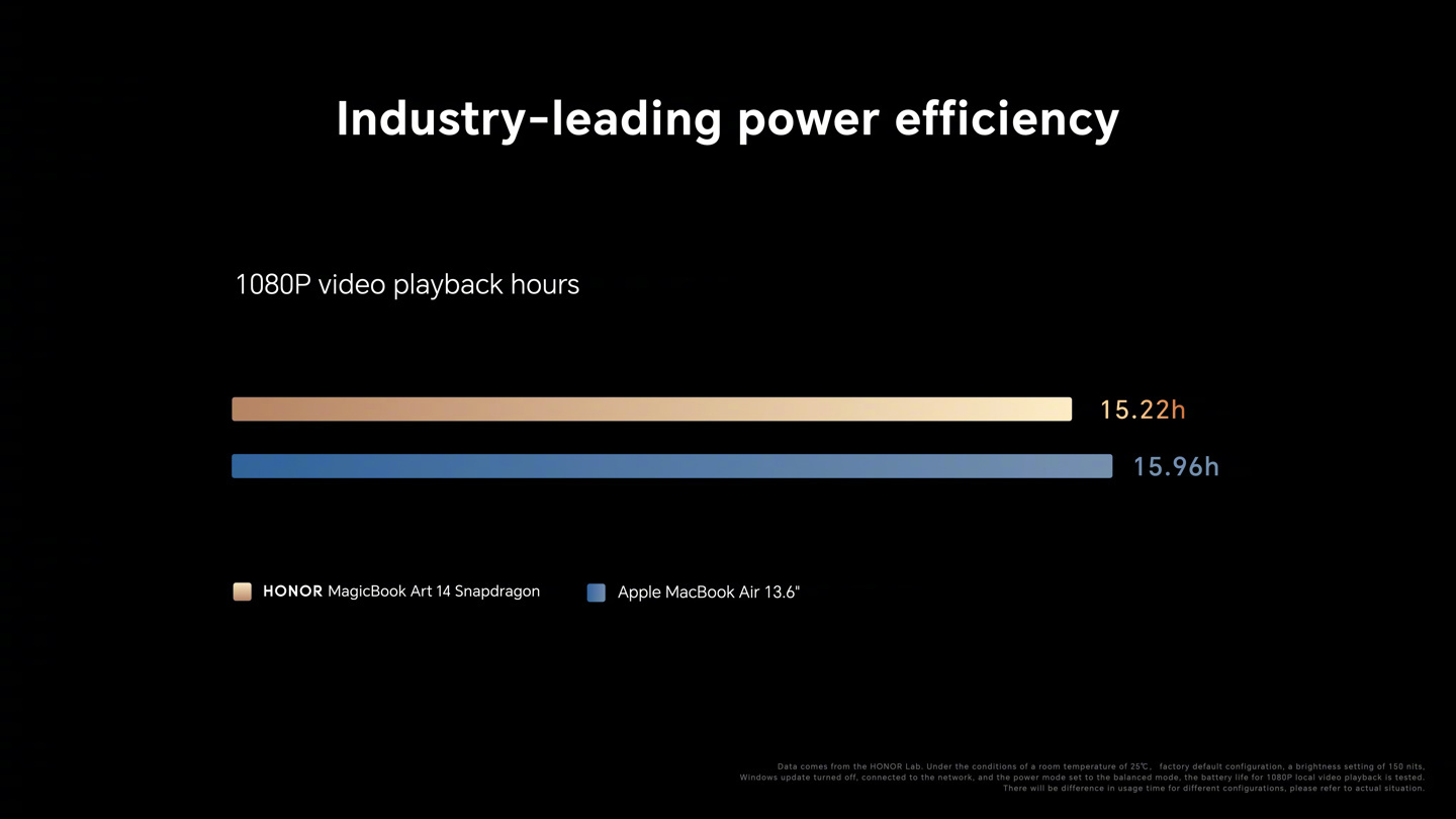 荣耀 MagicBook Art 14 骁龙版搭载 OS Turbo 智能功耗调度,1080P 视频播放可达 15.22 小时。