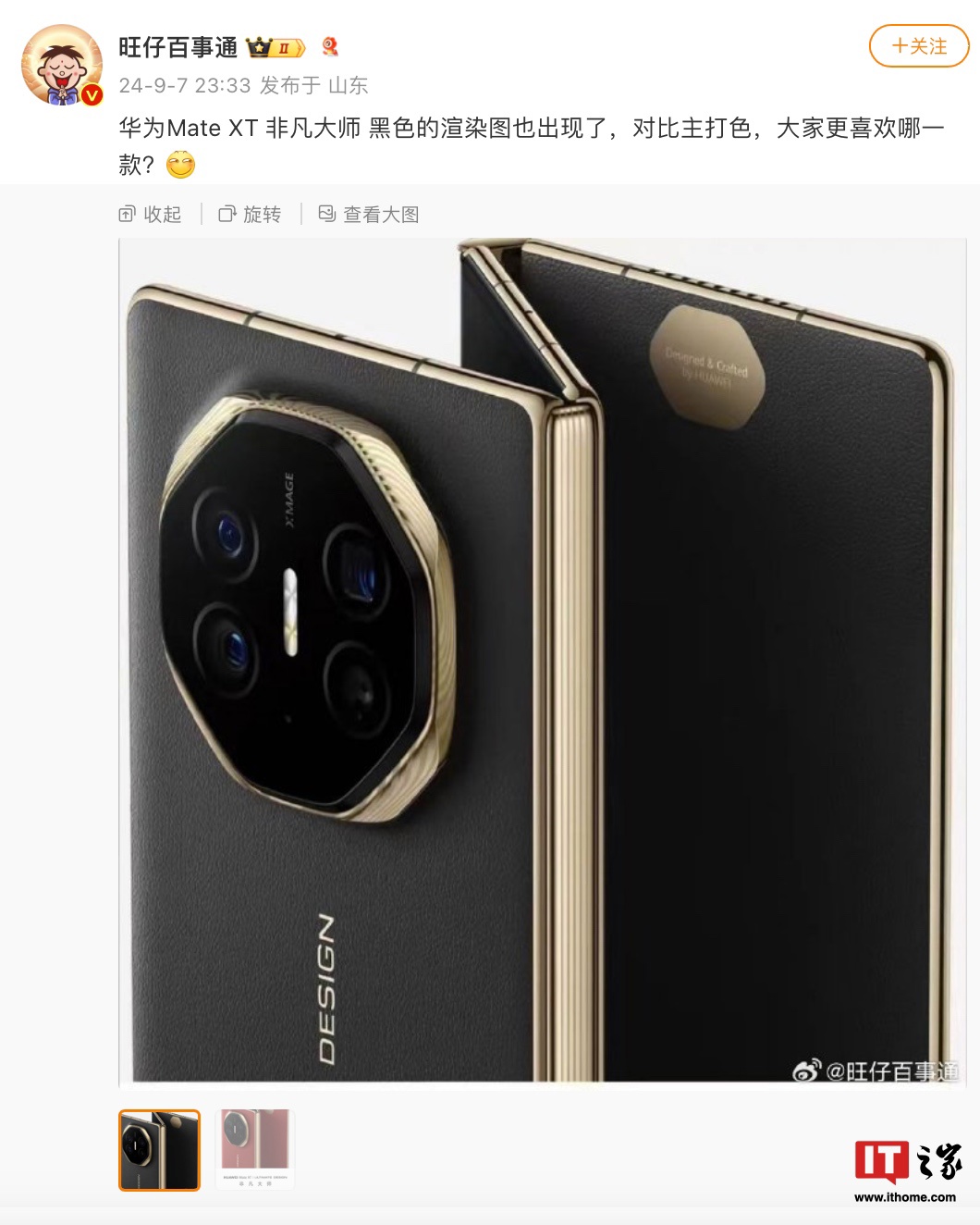 文章来源于互联网:IT之家-华为 Mate XT 非凡大师三折叠手机“玄黑”配色版曝光:黑金内敛风格