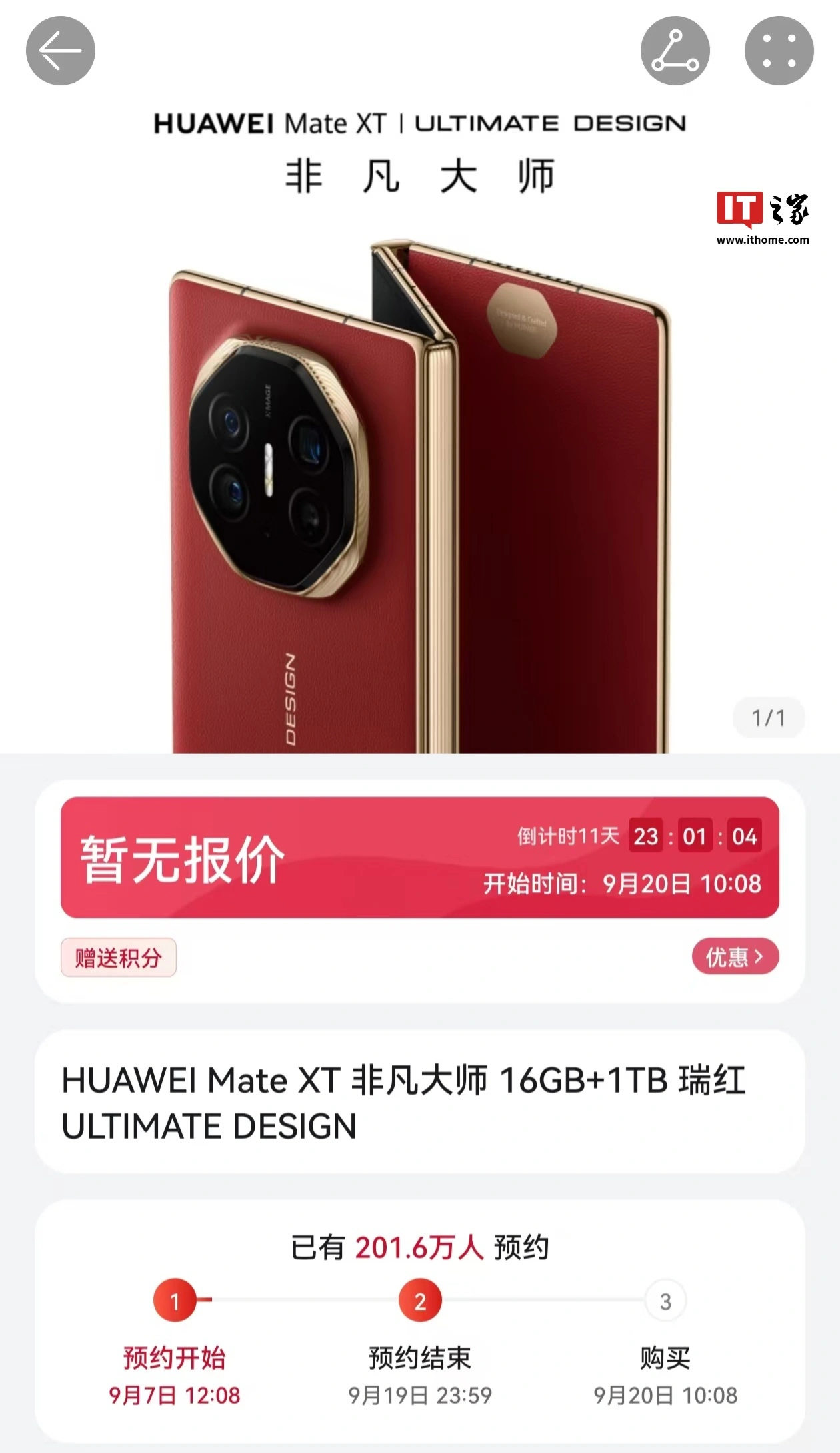 IT之家 9 月 8 日消息,华为 Mate XT 非凡大师三折叠手机于昨日 12:08 开启预订,将于 9 月 20 日 10:08 开售,该手机瑞红配色外观也同步放出。