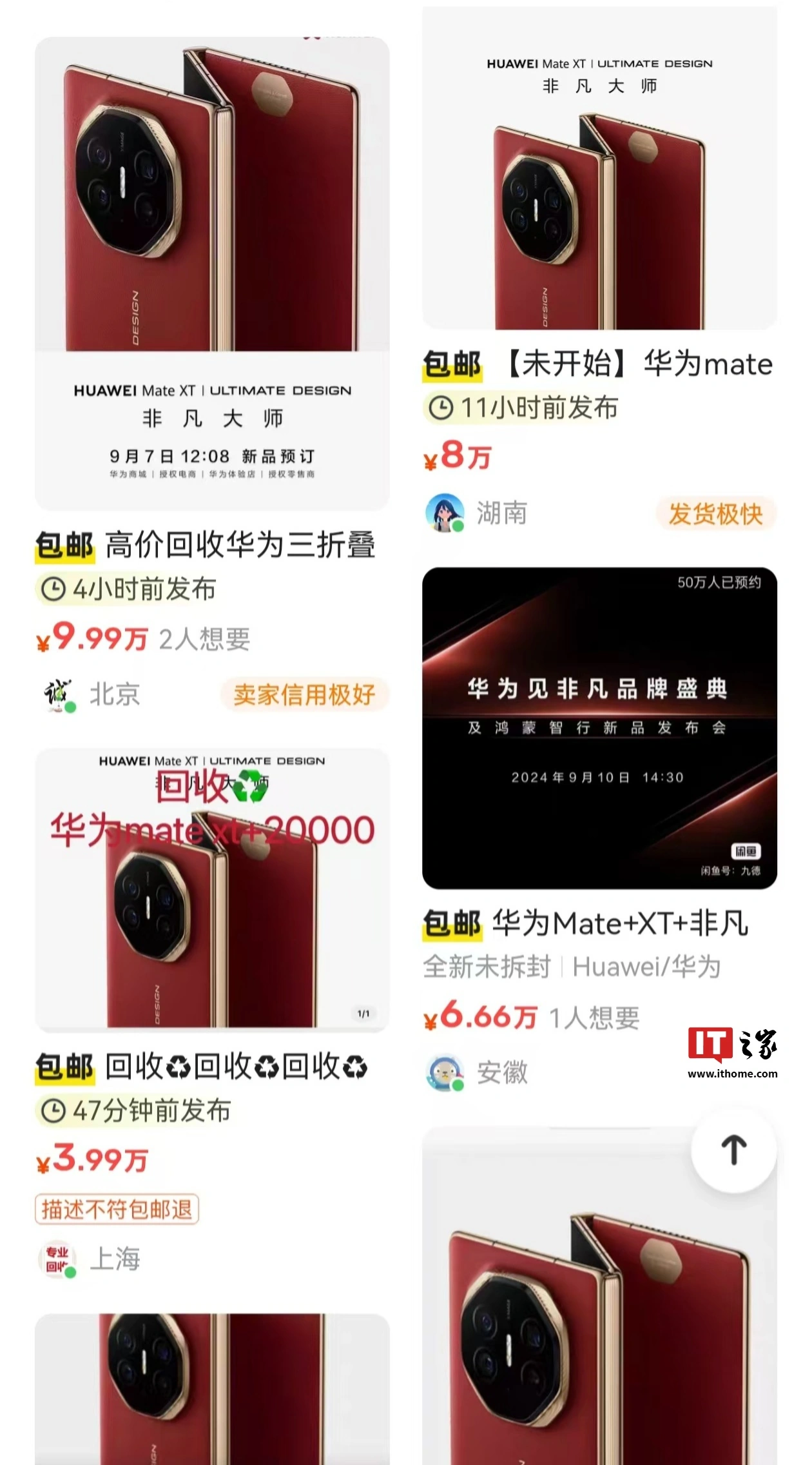 IT之家注意到,二手平台已出现“高价收购”华为 Mate XT 非凡大师三折叠手机的“用户”,加价基本在 1.5 万元左右(该手机售价暂未公布,指的是在后续公布的售价基础上加价 1.5 万元)。