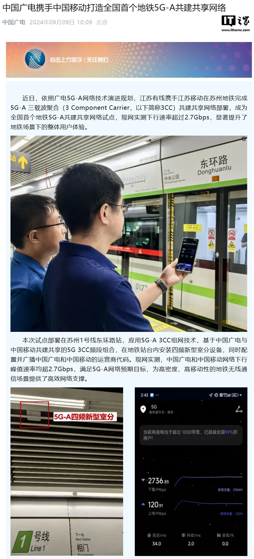 IT之家 9 月 9 日消息,据中国广电今日消息,依照广电 5G-A 网络技术演进规划,江苏有线携手江苏移动在苏州地铁近日完成 5G-A 三载波聚合(3 Component Carrier,以下简称 3CC)共建共享网络部署,成为全国首个地铁 5G-A 共建共享网络试点,现网实测下行速率超过 2.7Gbps,显著提升了地铁场景下的整体用户体验。