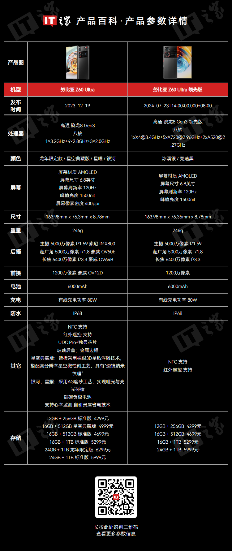 努比亚 Z 系列上一代旗舰机型 Z60 Ultra 手机搭载骁龙 8 Gen3 处理器,配备 6000mAh 大电池,支持 80W 有线快充,提供 IP68 防尘防水、USB 3.1、红外遥控等功能。另外,努比亚 Z60 Ultra 领先版手机也于今年 7 月开售,搭载骁龙 8 Gen3 领先版处理器,配备第六代屏下前摄。