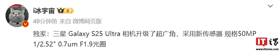 IT之家 9 月 9 日消息,据博主 @i冰宇宙 爆料,三星 Galaxy S25 Ultra 手机的相机部分升级了超广角,采用新传感器,规格 50MP 1/2.52″ 0.7um F1.9 光圈。