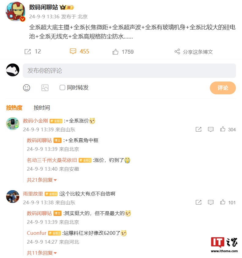 IT之家 9 月 9 日消息,博主 @数码闲聊站 今日发文爆料称,某厂系列新机全系超大底主摄 + 长焦微距 + 超声波 + 有玻璃机身 + 比较大的硅电池 + 无线充 + 高规格防尘防水。结合评论区讨论来看,预计为小米 15 系列手机。