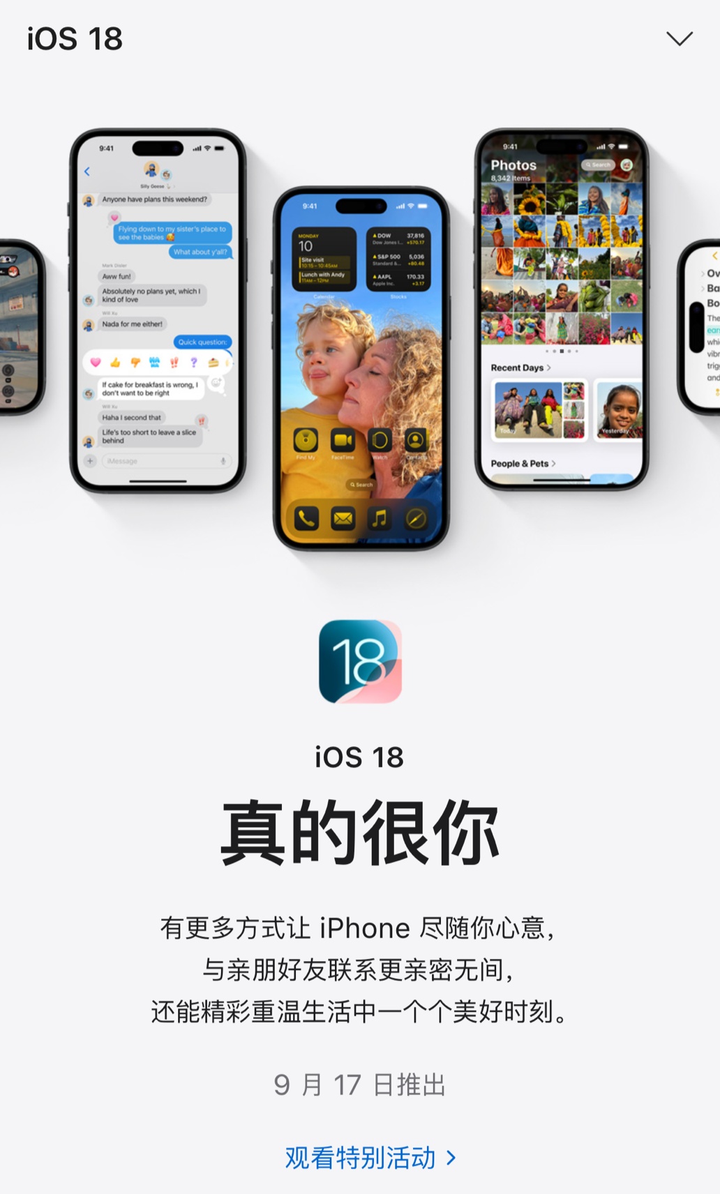 IT之家 9 月 10 日消息,苹果中国官网显示,iOS 18 和 iPadOS 18 的正式版更新将于北京时间 9 月 17 日推出。