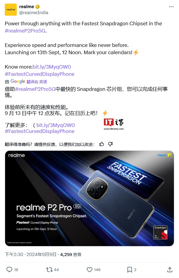 IT之家 9 月 10 日消息,科技媒体 MySmartPrice 昨日(9 月 9 日)报道,realme 真我 P2 Pro 手机现身 GeekBench 跑分库,显示该机搭载 12GB 内存,高通骁龙 7s Gen 2 芯片。