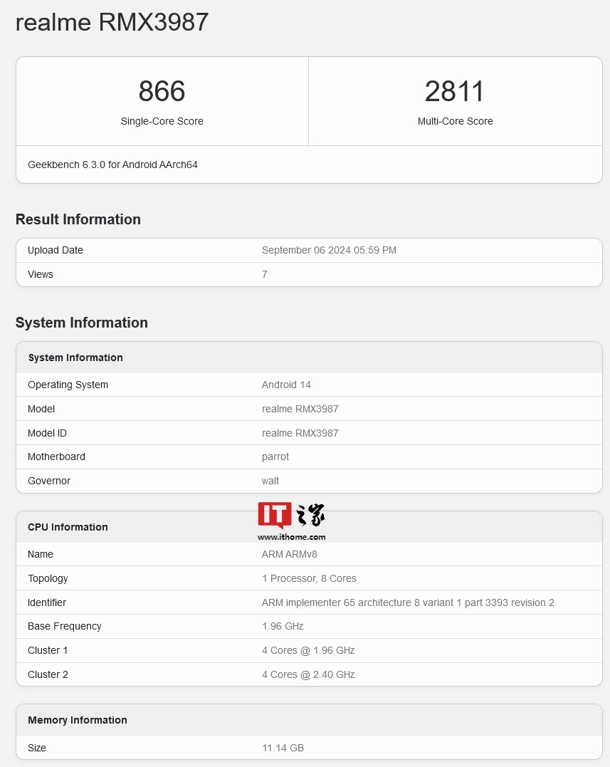 该机在 GeekBench 6.3.0 版本中单核成绩为 866 分,多核成绩为 2811 分。跑分库页面显示该机搭载 12GB 内存和安卓 14 系统,芯片主频为 2.40GHz,并搭载 Adreno 710 GPU,这表明 P2 Pro 将采用 Snapdragon 7s Gen 2 芯片组。