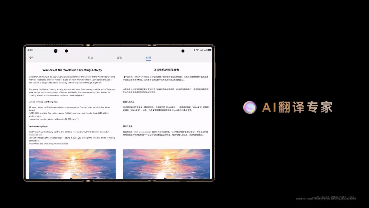 此外,出色的交互体验也离不开 AI。在华为 Mate XT 非凡大师上,搭载盘古大模型的小艺拥有系统级 AI 能力,能准确理解用户的意图,打造高效便捷的生产力工具。其集成了 AI 资深编辑、AI 信息顾问及 AI 翻译专家等功能,可以帮助你更加高效的完成各种任务。