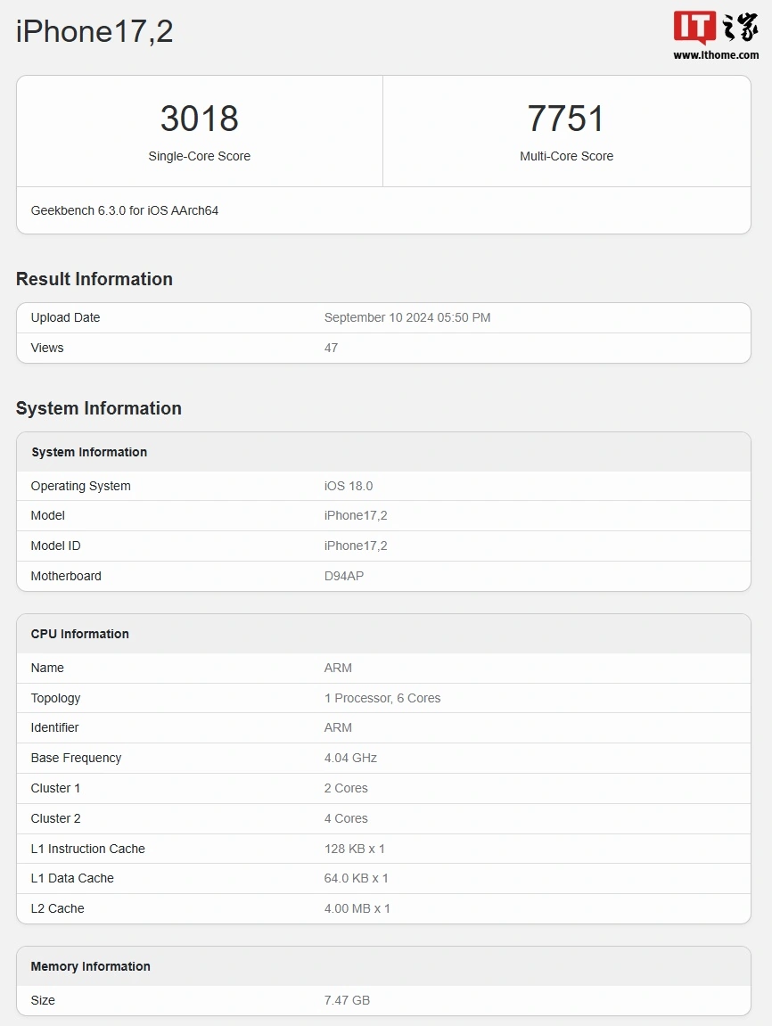 IT之家 9 月 11 日消息,苹果 iPhone 16 系列手机已于昨日凌晨发布,升级 A18 / Pro 芯片。IT之家今天早些时候曾报道 iPhone 16 Pro 系列的 GeekBench 跑分,A18 Pro 的表现并不理想,但最新的跑分已经出炉,这次跑分似乎更为正常一些。