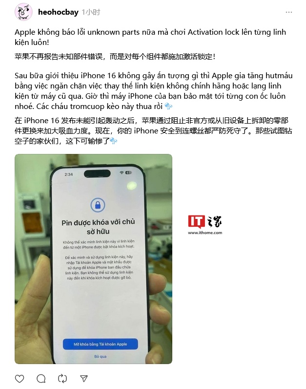 IT之家注:用户启用“激活锁”之后,不仅绑定用户苹果账号和当前使用的 iPhone,还会同步绑定电池、摄像头和显示屏等部件的独立序列号。