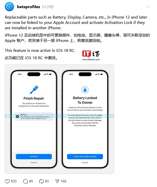 IT之家 9 月 13 日消息,科技媒体 9to5Mac 今天(9 月 13 日)发布博文,报道称苹果 iOS 18 RC 版本为 iPhone 零部件启用引入了“激活锁”(Activation Lock)功能。