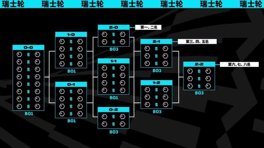 值得一提的是,瑞士轮中所有事关晋级或淘汰的关键比赛场次都采用三局两胜制(BO3),而其余比赛则是单场胜负(BO1)。