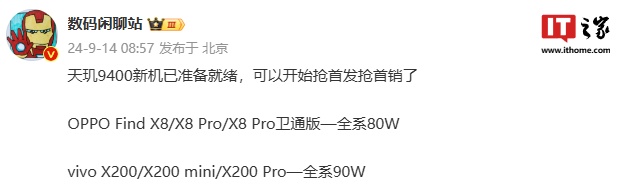 据IT之家此前报道,爆料显示 vivo X200 系列 / OPPO Find X8 系列手机目前排期为 10 月,并且早于小米 15 系列手机。vivo X200 系列手机预计搭载天玑 9400 处理器,而 OPPO Find X8 系列手机(不含 Ultra)已经计划排产,同样搭载天玑 9400 处理器。