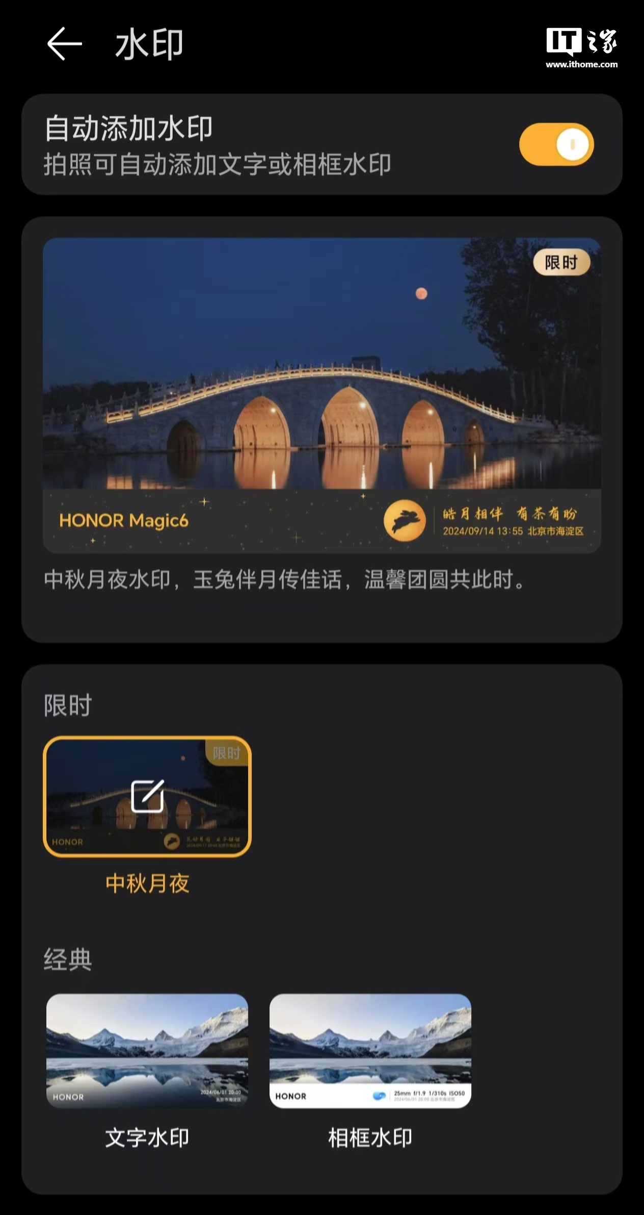 IT之家注意到,荣耀手机“中秋相机水印”为限时活动专属水印,仅在特定的时间内可使用,活动结束后将下架。