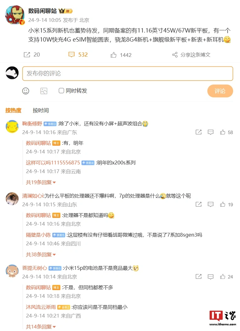 IT之家 9 月 14 日消息,博主 @数码闲聊站 今日发文爆料,小米 15 系列新机“蓄势待发”,同期备案的有 11.16 英寸 45W / 67W 新平板,有一个支持 10W 快充 4G eSIM 智能圆表。新品有“骁龙 8 Gen4 新机 + 旗舰级新平板 + 新表 + 新耳机”。
