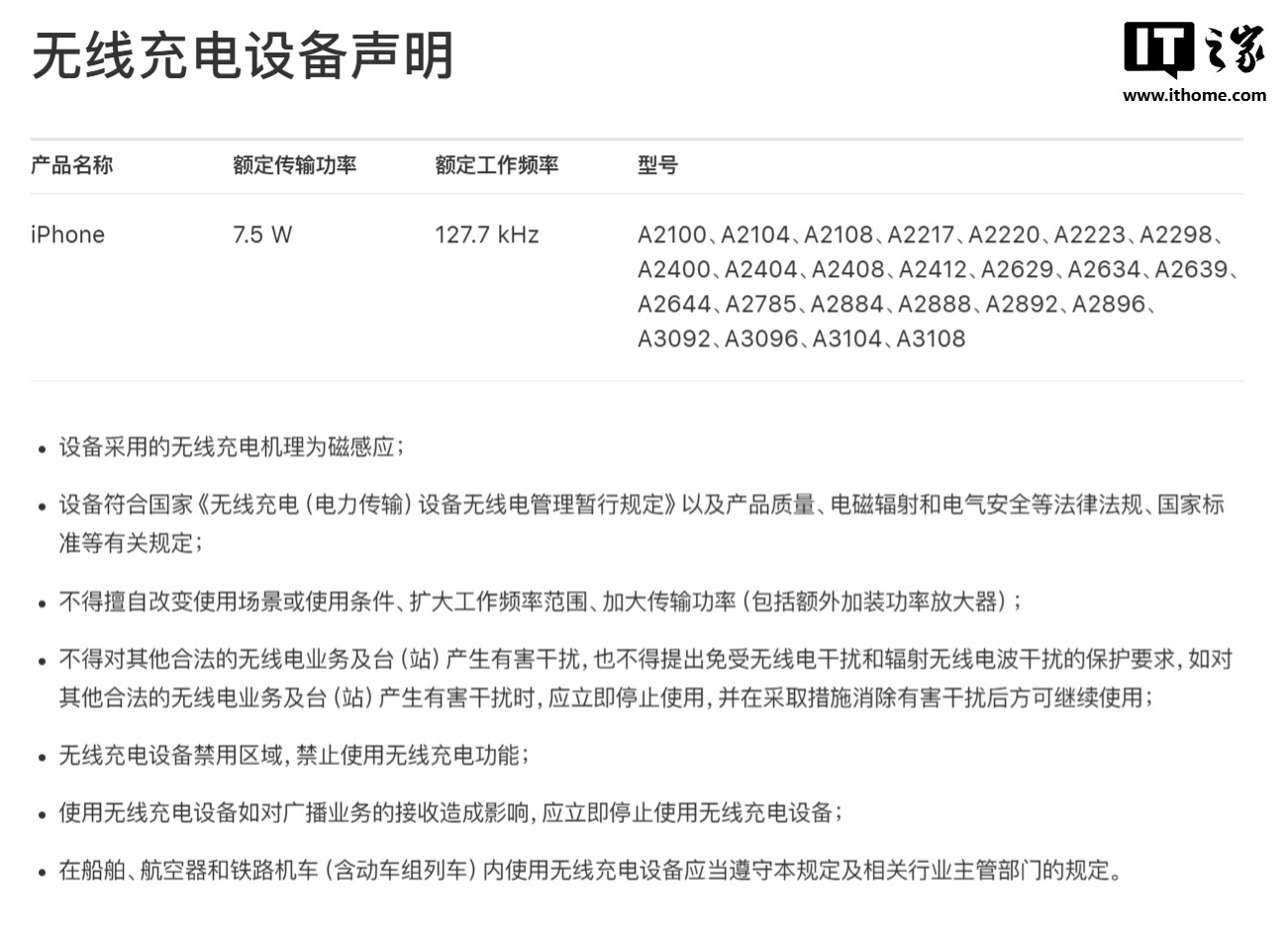 IT之家此前报道,在苹果中国官网的无线充电设备声明界面,iPhone 无线充电额定传输功率更改为 7.5W、工作频率 127.7kHz,提到设备符合国家《无线充电(电力传输)设备无线电管理暂行规定》。