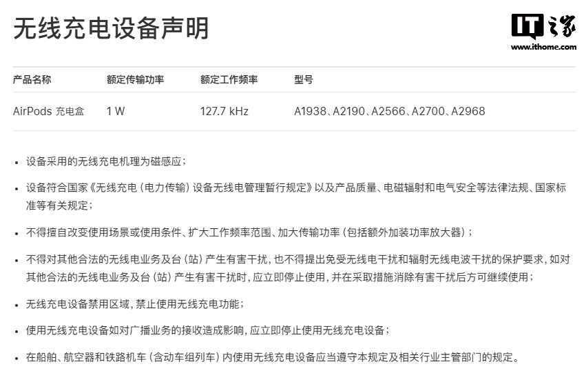 IT之家 9 月 15 日消息,《无线充电(电力传输)设备无线电管理暂行规定》已于今年 9 月 1 日起施行。苹果官网公布 AirPods 充电盒无线充电设备声明,型号为 A1938、A2190、A2566、A2700、A2968 的 AirPods 充电盒额定传输功率为 1W。