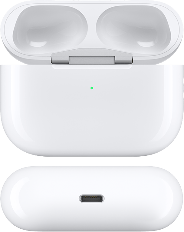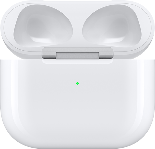 适用于 AirPods(第 3 代)的 MagSafe 充电盒与 Qi 认证的无线充电器兼容,并可通过磁力与兼容 MagSafe 的充电器相连。充电盒的底部有一个闪电端口,可用于插接充电。状态指示灯位于充电盒的正面,而序列号位于盒盖里侧