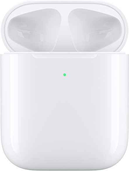 无线充电盒兼容 Qi 标准。充电盒的底部有一个闪电端口,可用于插接充电。状态指示灯位于充电盒的正面,而序列号位于盒盖里侧