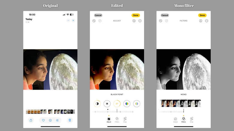 最后一个建议是应用照片应用中的单色滤镜。顾名思义,该滤镜将照片转换为黑白风格,赋予其经典的复古外观,将观众的注意力集中在图像的形状和纹理上。你也可以在拍照前选择单色滤镜。如果你不喜欢照片效果,可以在照片应用中去除滤镜并手动编辑。