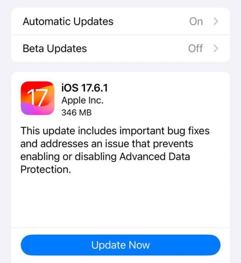 8 月 8 日消息,苹果公司今日向 iPhone 用户推送了 iOS 17.6.1 更新(内部版本号:21G93)。此次更新距离上次发布正式版仅间隔 9 天,主要解决了高级数据保护功能无法启用或禁用的问题。
