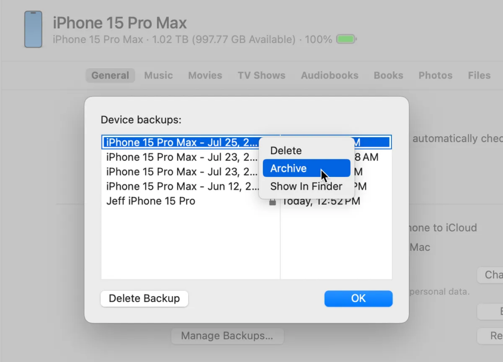 - 右键点击(或按Control键点击)您创建的备份,并选择“存档”。