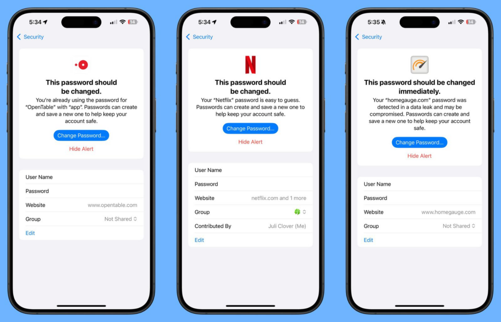 密码应用程序中有一个专门的安全部分,它会让您知道您的密码是否被重复使用、是否太弱或在数据泄露中被泄露。