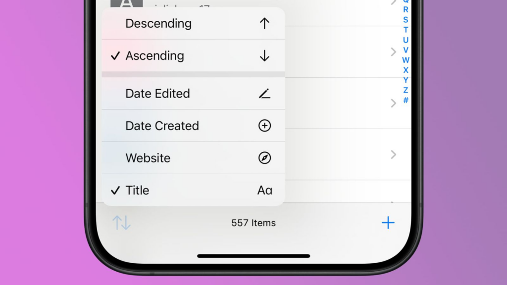 排序选项包括编辑日期、创建日期、网站或标题,通过点击所需选项,每个选项都可按降序或升序列表显示。
