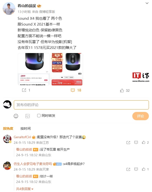 IT之家 9 月 16 日消息,博主 @看山的叔叔 昨日发文爆料,华为 Sound X4 音箱拥有 2 种配色,跟 Sound X 2021 基本一样,新增悦动白色,保留韵律黑色。音箱没有帝瓦雷,但有华为悦彰。