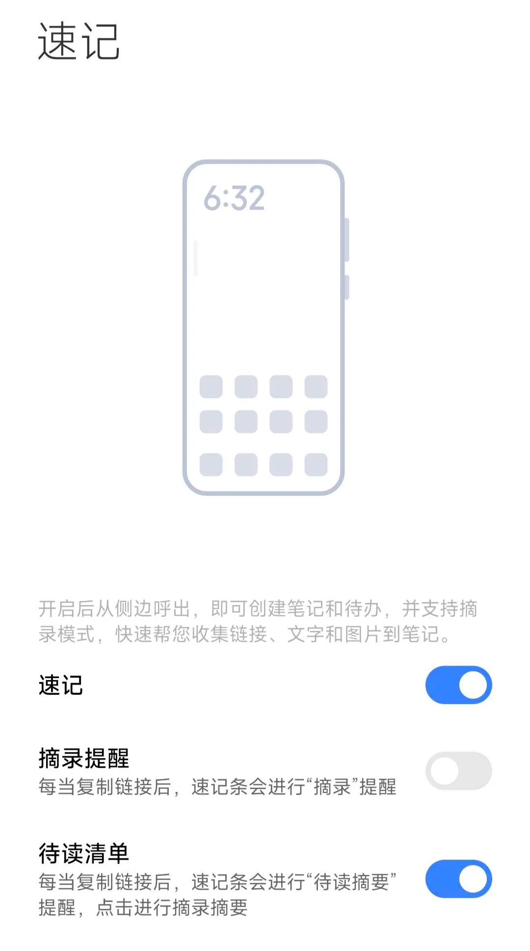 笔记 App → 设置 → 速记 → 打开待读清单