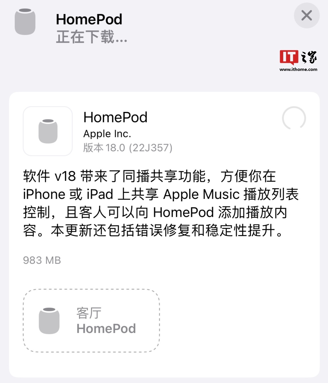 IT之家实测,此次更新面向 HomePod 全系列产品,包括初代 HomePod、HomePod mini 以及第二代 HomePod。