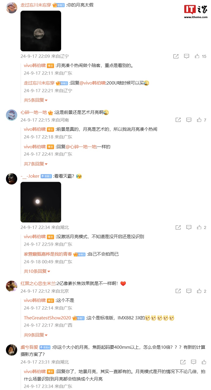 韩伯啸还在评论区回复了部分网友的问题:针对图片中的前景和月亮,他表示“前景是真的,月亮是艺术的,所以我说月亮凑个热闹”;有用户夸赞手机 2 亿像素长焦效果,韩伯啸称“这个不是”。