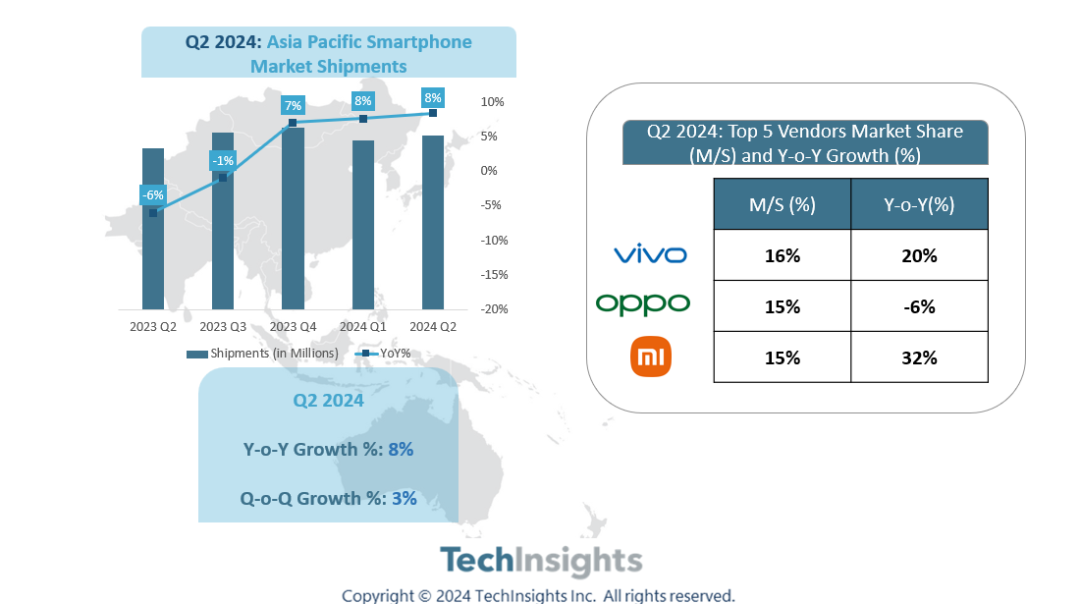 IT之家 9 月 18 日消息,TechInsights 的数据指出,2024 年 Q2,亚太地区智能手机市场同比增长 8%,与同期全球智能手机市场的增长率保持一致。