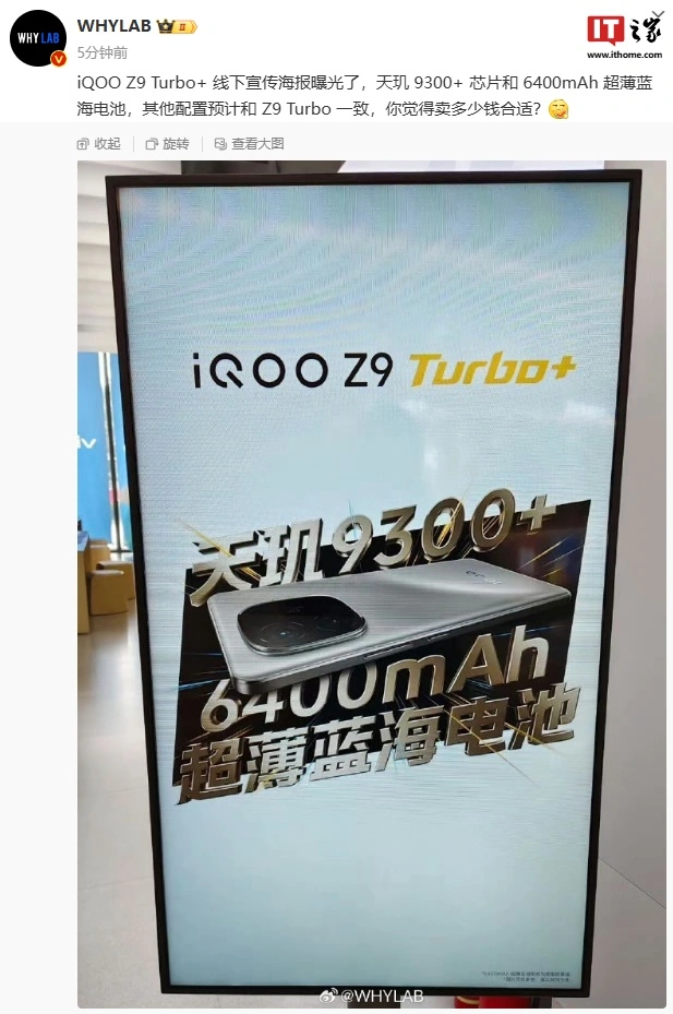 《iQOO Z9 Turbo+ 手机线下海报曝光:天玑 9300+ 芯片、6400mAh 超薄蓝海电池》