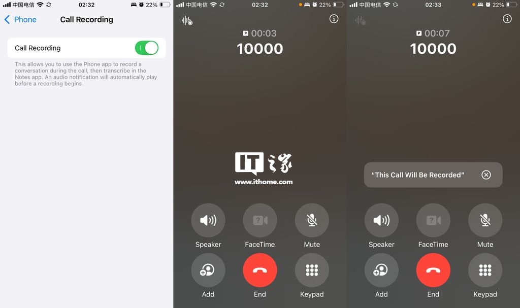 IT之家注意到,在 iPhone 开启通话录音后,参与通话的用户都会自动收到通话录音的语音提示。