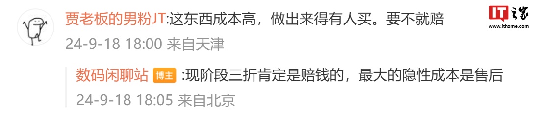 博主还提到:现阶段三折肯定是赔钱的,最大的隐性成本是售后。
