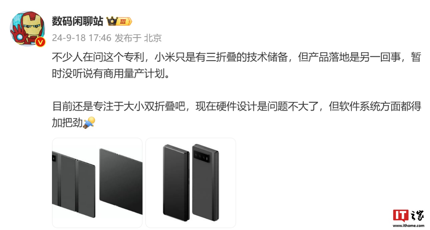 IT之家 9 月 18 日消息,博主 @数码闲聊站 今日谈及小米三折叠手机专利,称小米只是有三折叠的技术储备,但产品落地是另一回事,暂时没听说有商用量产计划。
